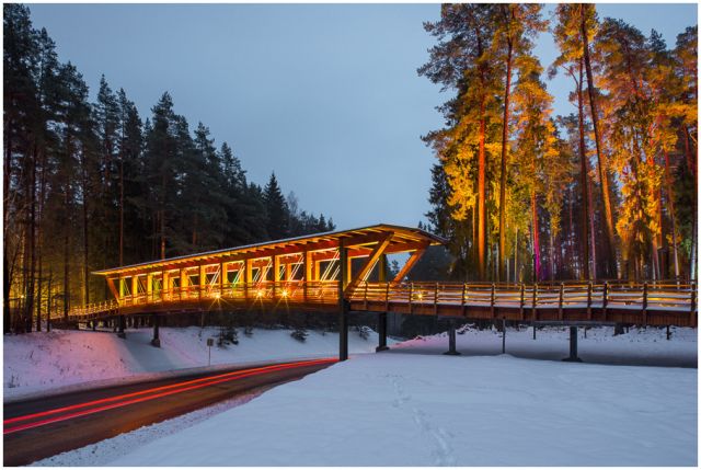 Tiltas - nestandartinis, su dideliu stogu. Medis buvo panaudotas ne tik jo konstrukcijai, bet ir apdailai. Šis statinys žurnalo „Latvijos statyba“ („Latvijas būvnieciba“ ) pelnė 3-ią vietą nominacijoje „Medinė statyba“.